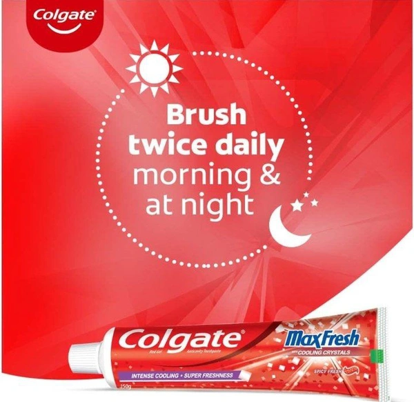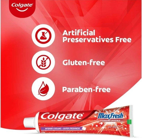 Colgate Maxfresh toothpaste contains menthol that gives intense cooling and super freshness. It fights cavities, keeps germ build-up at bay and makes your teeth whiter on continuous use.