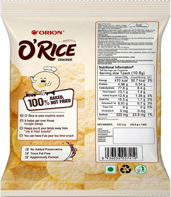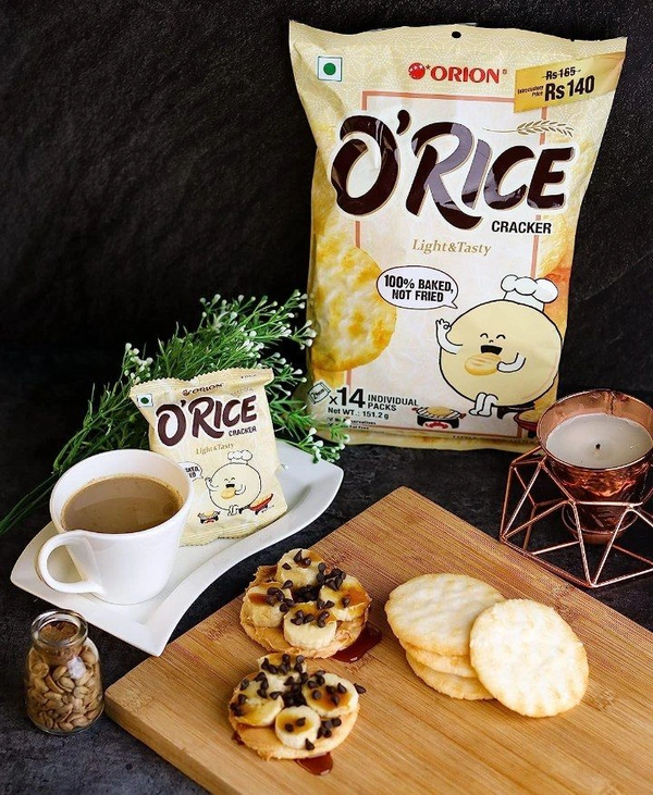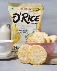 Orion O'Rice Cracker is a slightly sweet and salty rice cracker specifically designed for active adults & kids. This light and tasty snack is 100% baked and not fried. It can be consumed as a snack at any time of the day - mid-morning, evening or tea time. Its is 100% vegetarian.