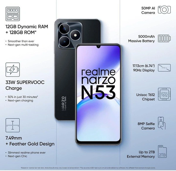 realme narzo N53 (Feather Black, 8GB+128GB) 33W Segment Fastest Charging | Slimmest Phone in Segment | 90 Hz Smooth Display